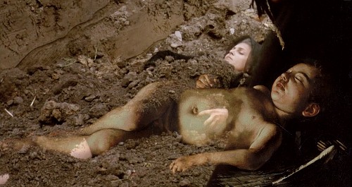 Contrairement aux autres montages de la série, à l’exception de celui de Méduse, il ne procède pas par enchaînement d’une série de détails déstructurant le tableau-source, mais impose ce dernier comme un filtre immuable plaqué directement sur l’extrait de film. Telle la pointe d’une flèche, le tableau ancre la représentation dans la profondeur du cadre. Il impose une forme de pesanteur qui empêche toute issue ou mouvement d’échappée et scelle le destin inéluctable du personnage. Recouvrant Emilia, à l’instar des pelletées de terre qui sont lancées sur elle, il l’entraîne dans la tombe qui finira par l’ensevelir.