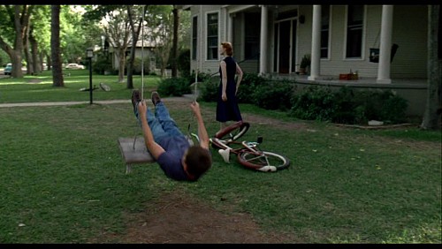 Contrairement au premier, le second montage épouse fidèlement le mouvement de l’objet. La balançoire n’y est cette fois pas partagée et les corps, limités à la présence de la mère et d’un de ses fils (Jack interprété dans le film par Hunter McCracken), se déploient dans des trajectoires individuelles, parallèles sans véritable point de rencontre si ce n’est ceux que proposent furtivement des regards fuyants et non partagés où les liens se desserrent aussitôt après avoir été noués. La luminosité des premiers plans a laissé place à une ambiance plus sombre où les corps se perdent dans la distance, s’évitent dans les effets de glissement. En suivant assez strictement la logique de battement de la balançoire dans l’espace, le montage acquiert une dimension quasi-machinique qui désincarne la scène et en épuise la substance.
